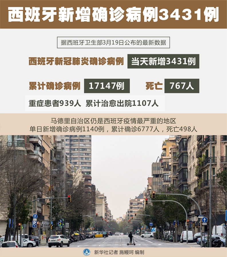 新華社馬德里3月19日電(謝宇智)據(jù)西班牙衛(wèi)生部19日公布的最新數(shù)據(jù),該國當天新增3431例新冠肺炎確診病例,累計確診病例為17147例,死亡767人,重癥患者939人,累計治愈出院1107人。