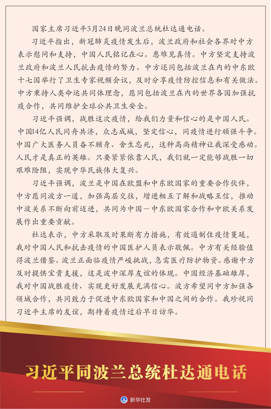新華社北京3月24日電? 國(guó)家主席習(xí)近平24日晚同波蘭總統(tǒng)杜達(dá)通電話。