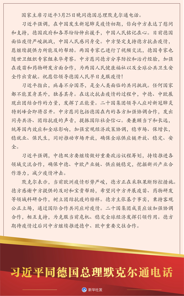 習近平指出,病毒不分國界,是全人類面臨的共同挑戰(zhàn)。任何國家都不能置身其外,獨善其身。在這次抗擊疫情的過程中,中德、中歐展現出團結合作的力量,發(fā)揮了正能量。二十國集團領導人應對新冠肺炎特別峰會即將召開。中方愿同包括德國在內的各方加強協(xié)調合作,發(fā)出同舟共濟、團結抗疫的聲音,提振國際社會信心。要兼顧當下和長遠,統(tǒng)籌國內效應和全球影響,加強宏觀經濟政策協(xié)調,穩(wěn)市場、保增長,穩(wěn)就業(yè)、保民生,同時推動市場開放,確保全球供應鏈開放、穩(wěn)定、安全。