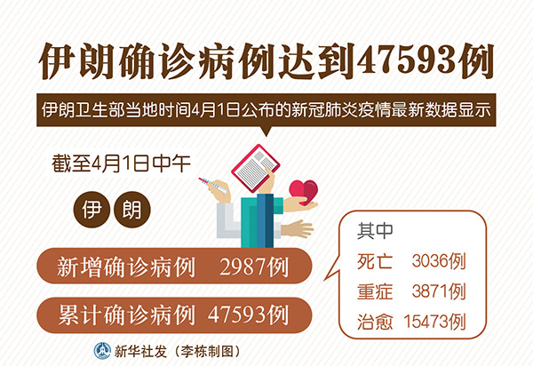 新華社德黑蘭4月1日電(記者陳霖)伊朗衛(wèi)生部4月1日公布的新冠肺炎疫情最新數(shù)據(jù)顯示,截至當天中午,伊朗新增確診病例2987例,累計確診病例47593例,其中死亡3036例,重癥3871例,治愈15473例。
