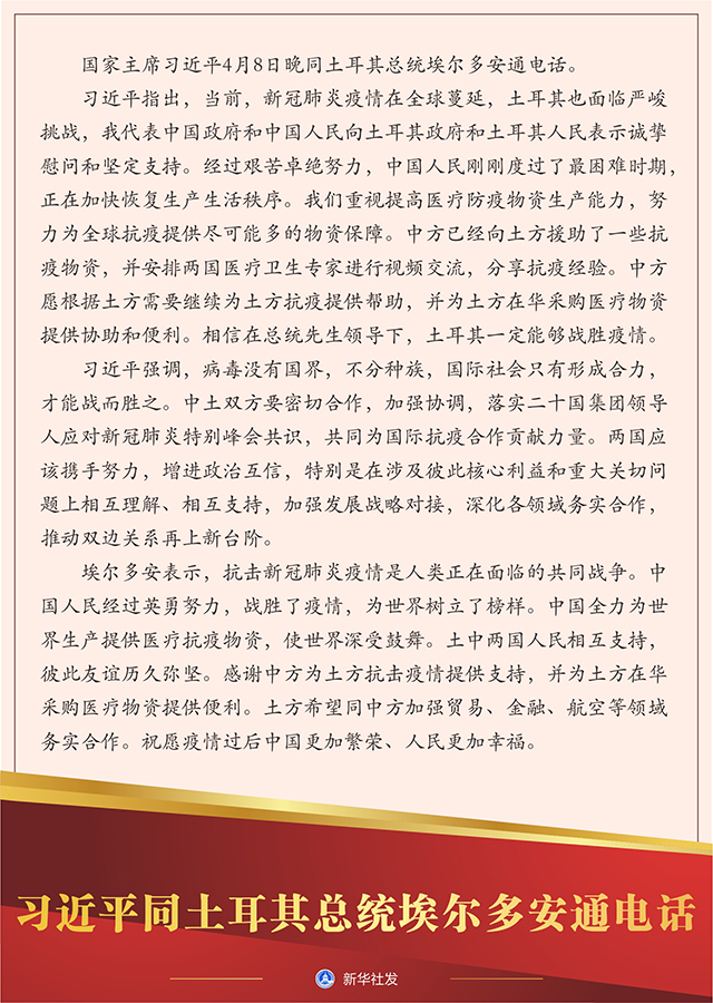 習(xí)近平指出,當(dāng)前,新冠肺炎疫情在全球蔓延,土耳其也面臨嚴(yán)峻挑戰(zhàn),我代表中國(guó)政府和中國(guó)人民向土耳其政府和土耳其人民表示誠(chéng)摯慰問和堅(jiān)定支持。經(jīng)過艱苦卓絕努力,中國(guó)人民剛剛度過了最困難時(shí)期,正在加快恢復(fù)生產(chǎn)生活秩序。我們重視提高醫(yī)療防疫物資生產(chǎn)能力,努力為全球抗疫提供盡可能多的物資保障。中方已經(jīng)向土方援助了一些抗疫物資,并安排兩國(guó)醫(yī)療衛(wèi)生專家進(jìn)行視頻交流,分享抗疫經(jīng)驗(yàn)。中方愿根據(jù)土方需要繼續(xù)為土方抗疫提供幫助,并為土方在華采購(gòu)醫(yī)療物資提供協(xié)助和便利。相信在總統(tǒng)先生領(lǐng)導(dǎo)下,土耳其一定能夠戰(zhàn)勝疫情。