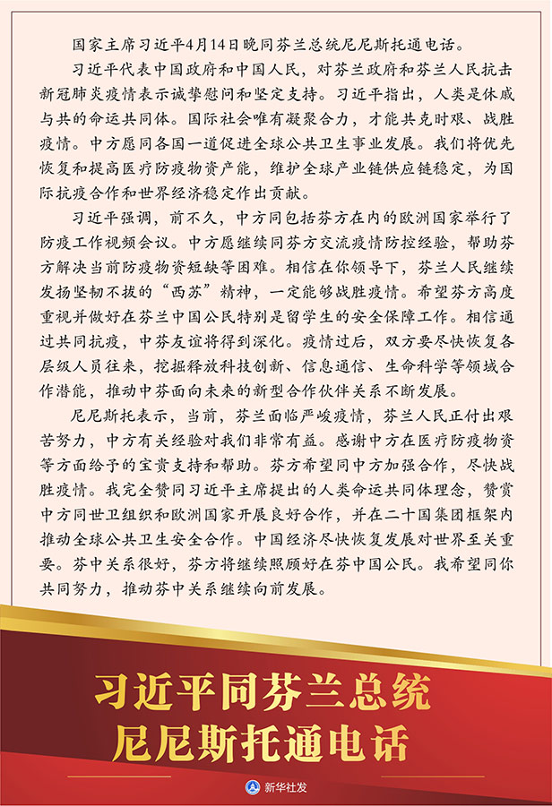 習(xí)近平強(qiáng)調(diào),前不久,中方同包括芬方在內(nèi)的歐洲國家舉行了防疫工作視頻會(huì)議。中方愿繼續(xù)同芬方交流疫情防控經(jīng)驗(yàn),幫助芬方解決當(dāng)前防疫物資短缺等困難。相信在你領(lǐng)導(dǎo)下,芬蘭人民繼續(xù)發(fā)揚(yáng)堅(jiān)韌不拔的“西蘇”精神,一定能夠戰(zhàn)勝疫情。希望芬方高度重視并做好在芬蘭中國公民特別是留學(xué)生的安全保障工作。相信通過共同抗疫,中芬友誼將得到深化。疫情過后,雙方要盡快恢復(fù)各層級人員往來,挖掘釋放科技創(chuàng)新、信息通信、生命科學(xué)等領(lǐng)域合作潛能,推動(dòng)中芬面向未來的新型合作伙伴關(guān)系不斷發(fā)展。