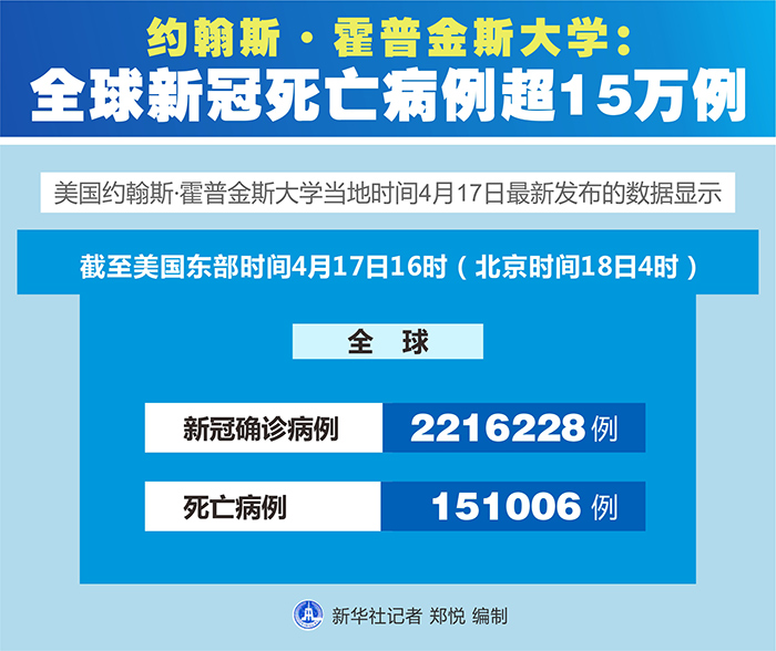新華社紐約4月17日電 美國約翰斯·霍普金斯大學(xué)17日最新發(fā)布的數(shù)據(jù)顯示,截至美國東部時間17日16時(北京時間18日4時),全球新冠死亡病例超過15萬例,達(dá)到151006例,全球確診病例達(dá)2216228例。