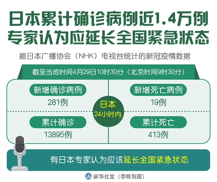 新華社東京4月29日電(記者華義)據(jù)日本廣播協(xié)會(huì)(NHK)電視臺(tái)統(tǒng)計(jì)的新冠疫情數(shù)據(jù),截至29日10時(shí)30分(北京時(shí)間9時(shí)30分),日本24小時(shí)內(nèi)新增確診病例281例,累計(jì)確診13895例;新增死亡病例19例,累計(jì)死亡413例。有日本專家認(rèn)為應(yīng)該延長(zhǎng)全國(guó)緊急狀態(tài)。
