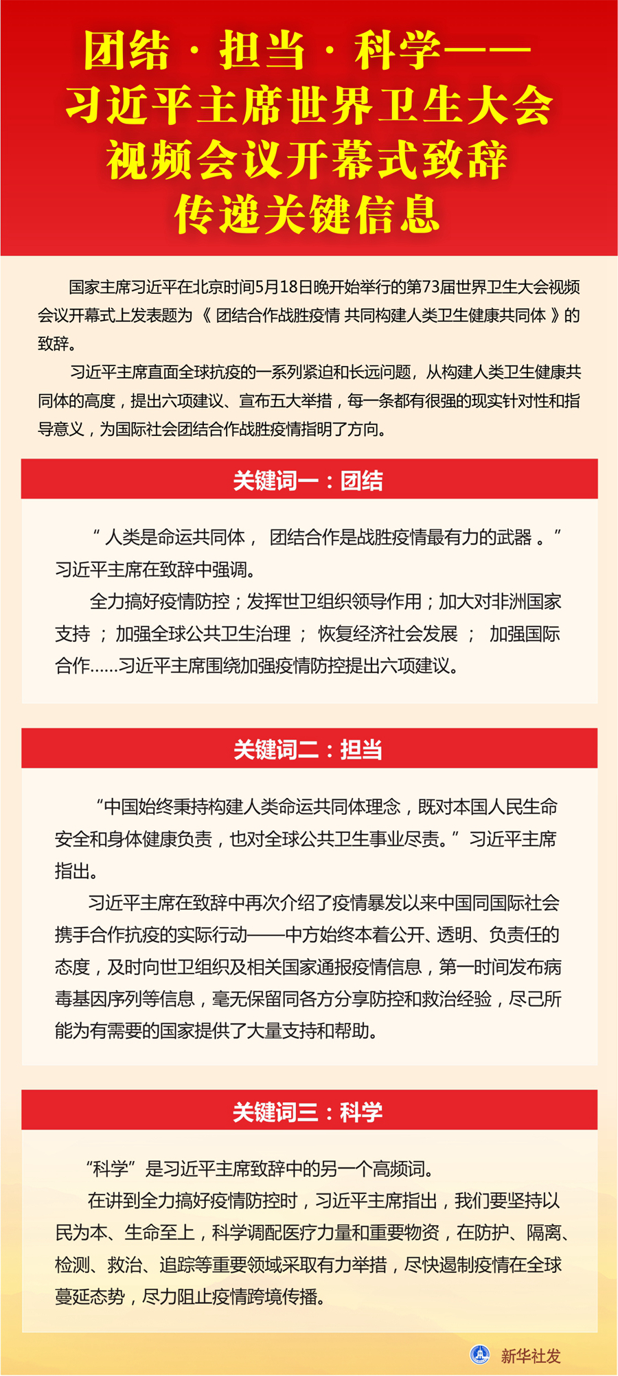 新華社北京5月18日電? 綜合新華社駐外記者報道:國家主席習(xí)近平18日晚在第73屆世界衛(wèi)生大會視頻會議開幕式上發(fā)表題為《團(tuán)結(jié)合作戰(zhàn)勝疫情 共同構(gòu)建人類衛(wèi)生健康共同體》的致辭。世界衛(wèi)生組織官員及多國人士認(rèn)為,習(xí)近平主席在致辭中提出的加強疫情防控六項建議、中國為推進(jìn)全球抗疫合作的五大舉措秉持構(gòu)建人類命運共同體理念,體現(xiàn)了中國負(fù)責(zé)任大國擔(dān)當(dāng),對推動抗擊疫情國際合作具有重要意義。