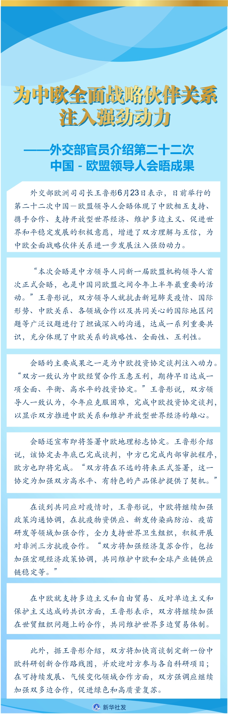 新華社北京6月23日電(記者王賓)外交部歐洲司司長王魯彤23日表示,日前舉行的第二十二次中國-歐盟領(lǐng)導(dǎo)人會晤體現(xiàn)了中歐相互支持、攜手合作、支持開放型世界經(jīng)濟、維護多邊主義、促進世界和平穩(wěn)定發(fā)展的積極意愿,增進了雙方理解與互信,為中歐全面戰(zhàn)略伙伴關(guān)系進一步發(fā)展注入強勁動力。