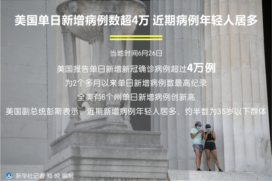 新華社華盛頓6月26日電(記者譚晶晶)美國(guó)26日?qǐng)?bào)告單日新增新冠確診病例超過(guò)4萬(wàn)例,為2個(gè)多月以來(lái)單日新增病例數(shù)最高紀(jì)錄。全美有6個(gè)州單日新增病例創(chuàng)新高。美國(guó)副總統(tǒng)彭斯表示,近期新增病例年輕人居多,約半數(shù)為35歲以下群體。