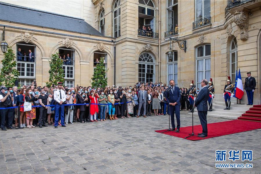 7月3日,在法國(guó)巴黎總理府,卸任總理愛德華·菲利普與新任總理讓·卡斯泰出席權(quán)力交接儀式。新華社發(fā)(奧雷利安·莫里薩爾 攝)