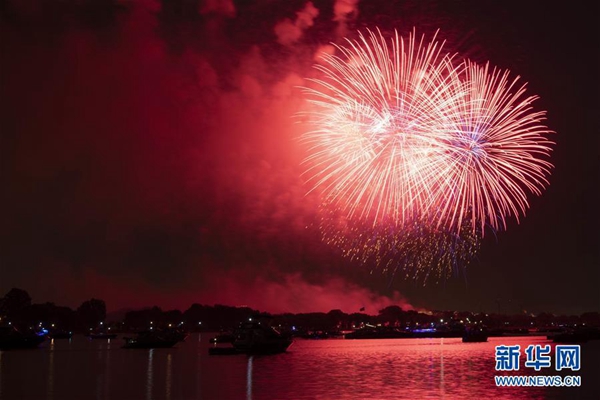 7月4日,焰火在美國華盛頓上空綻放,慶祝美國獨(dú)立日。新華社記者 劉杰 攝