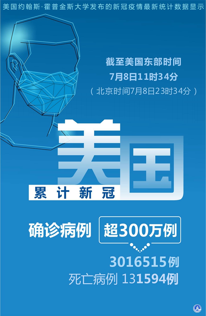 新華社紐約7月8日電 美國約翰斯·霍普金斯大學(xué)8日發(fā)布的新冠疫情最新統(tǒng)計數(shù)據(jù)顯示,美國累計確診病例超過300萬例。