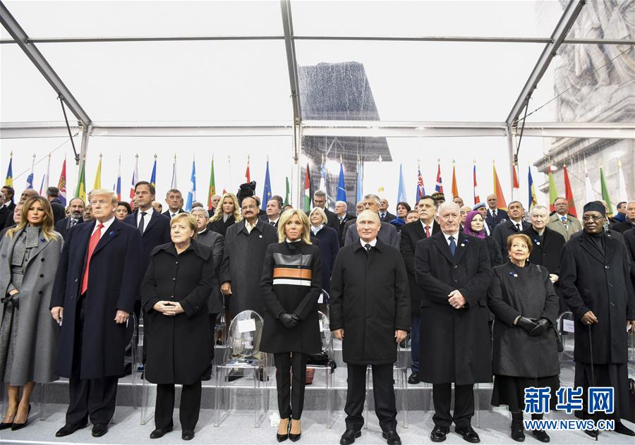 2018年11月11日,在法國巴黎,俄羅斯總統(tǒng)普京(前右四)、德國總理默克爾(前左三)與美國總統(tǒng)特朗普(前左二)出席紀(jì)念儀式。當(dāng)日,法國政府在巴黎凱旋門前舉行儀式,隆重紀(jì)念第一次世界大戰(zhàn)結(jié)束一百周年。新華社記者 陳益宸 攝
