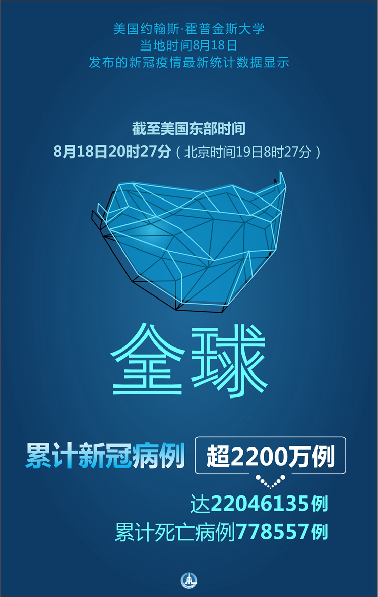 海報(bào):約翰斯·霍普金斯大學(xué):全球累計(jì)新冠病例超2200萬(wàn)例 新華社記者 施鰻珂 編制