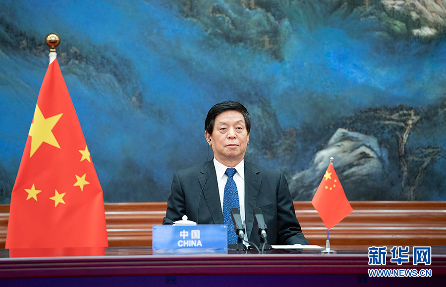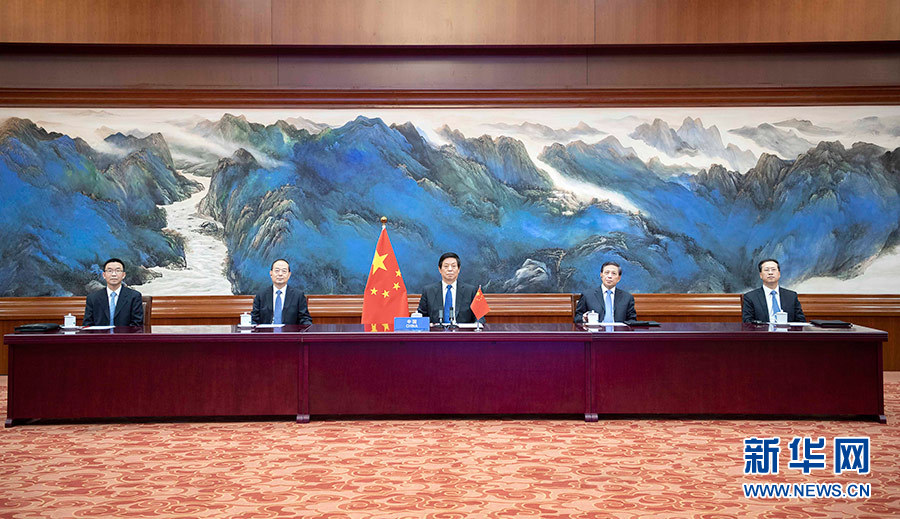 8月19日,全國人大常委會委員長栗戰(zhàn)書在北京人民大會堂出席第五次世界議長大會視頻會議。 新華社記者 李濤 攝