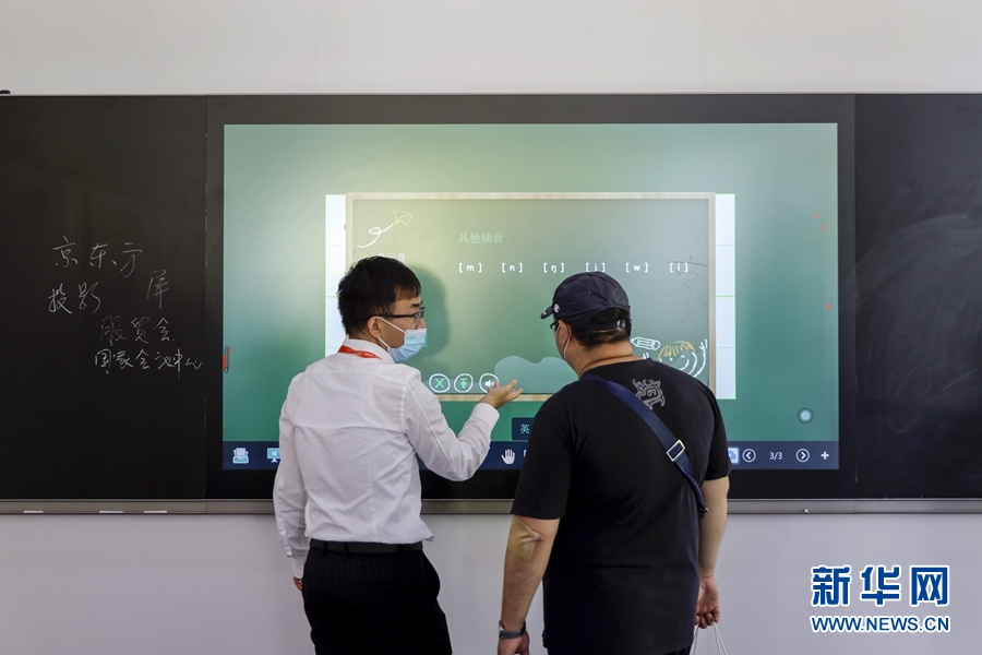 9月5日,一名男子在服貿(mào)會5G通信服務(wù)專題展區(qū)了解一款智慧黑板。此產(chǎn)品可實(shí)現(xiàn)普通黑板書寫、電子白板交互、數(shù)字資源調(diào)用、多媒體課件演示、音頻錄制、遠(yuǎn)程交互及直播等功能。 新華社記者 李木子 攝
