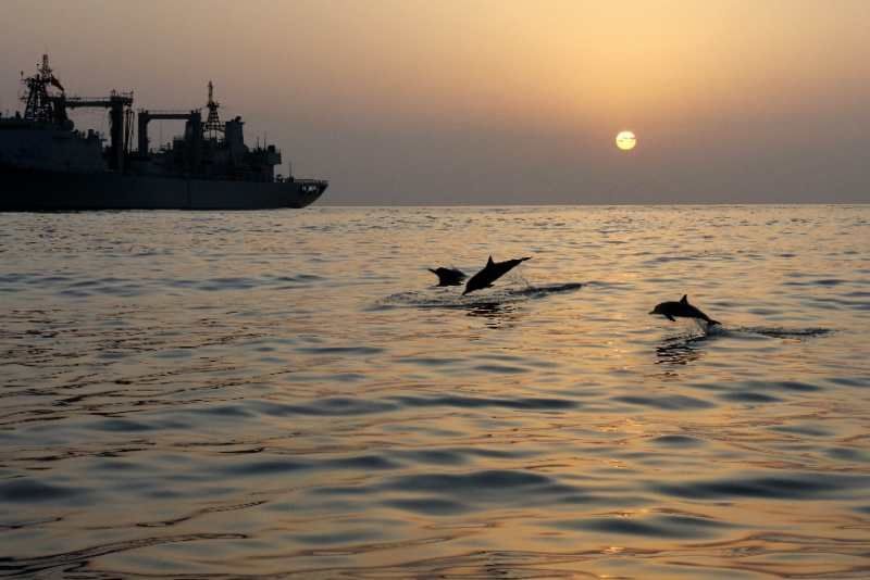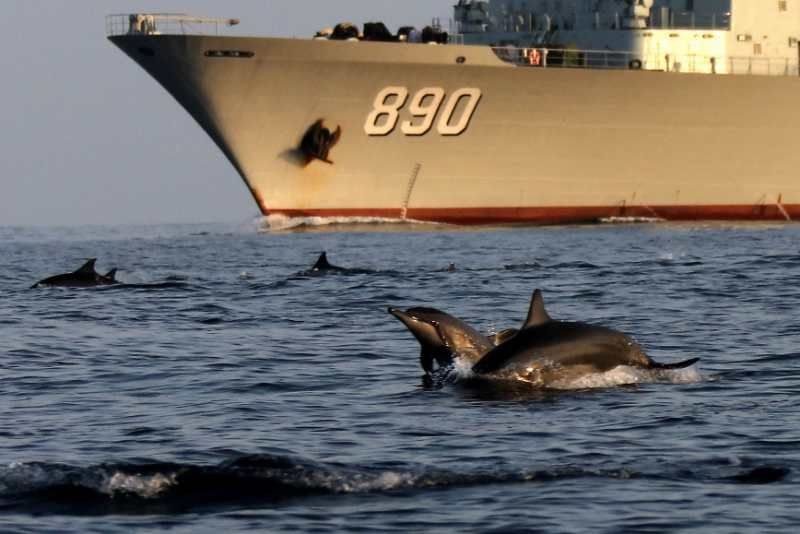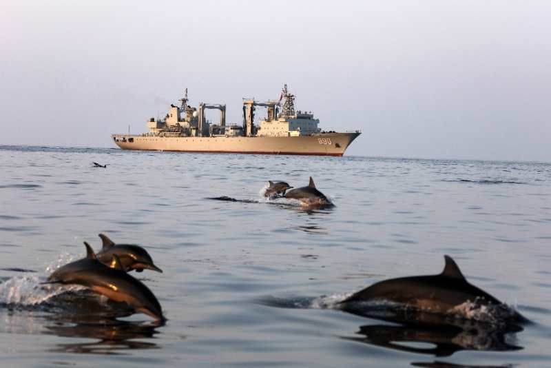 中國(guó)海軍赴亞丁灣索馬里海域護(hù)航編隊(duì)始終秉持海洋命運(yùn)共同體理念,堅(jiān)持人與大海和諧相處,注重生態(tài)環(huán)境保護(hù),贏得大自然積極回報(bào),經(jīng)常出現(xiàn)編隊(duì)艦艇航行時(shí)有成群海豚伴航、待機(jī)集結(jié)時(shí)有各類魚(yú)群相伴的和諧場(chǎng)景。