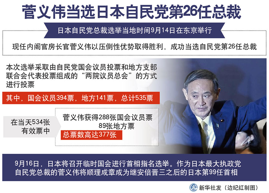本次選舉采取由自民黨國會(huì)議員投票和地方支部聯(lián)合會(huì)代表投票組成的“兩院議員總會(huì)”的方式進(jìn)行投票。其中,國會(huì)議員394票,地方141票,總計(jì)535票。選舉結(jié)果顯示,在當(dāng)天534張有效票中,菅義偉獲得288張國會(huì)議員票、89張地方票,總票數(shù)高達(dá)377張,遠(yuǎn)遠(yuǎn)高于獲得89票的自民黨政務(wù)調(diào)查會(huì)長岸田文雄和獲得68票的前干事長石破茂。