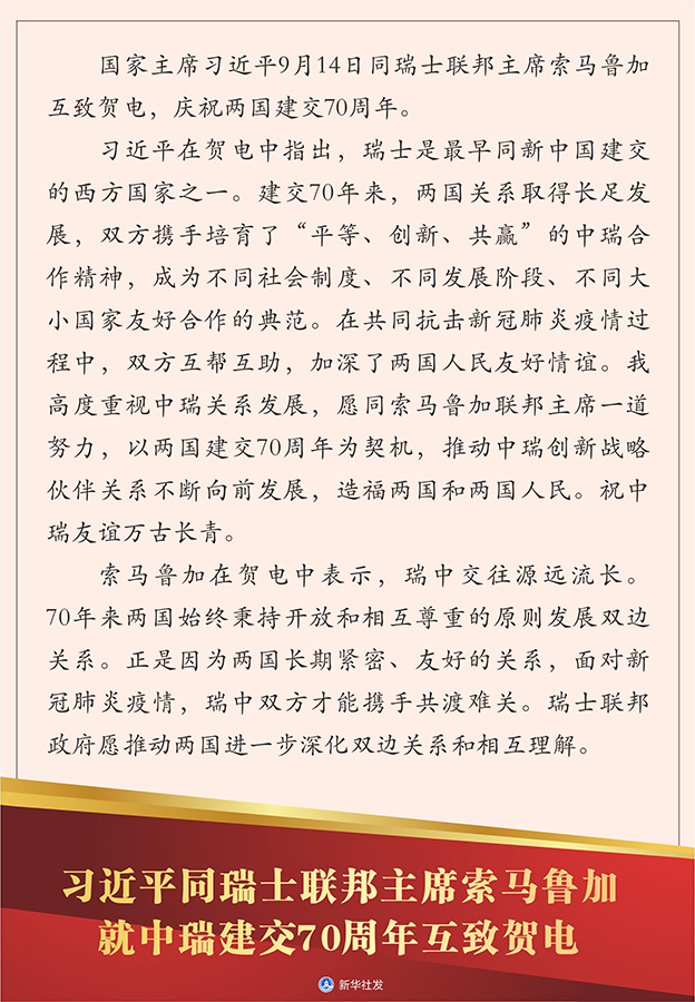 新華社北京9月14日電 國家主席習(xí)近平9月14日同瑞士聯(lián)邦主席索馬魯加互致賀電,慶祝兩國建交70周年。