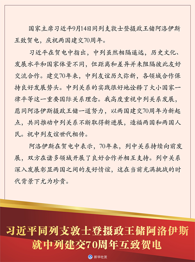 習近平在賀電中指出,中列雖然相隔遙遠,歷史文化、發(fā)展水平和國家體量不同,但距離和差異并未阻隔彼此友好交流合作。建交70年來,中列友誼歷久彌新,各領域合作保持良好發(fā)展勢頭。中列關系的實踐很好地詮釋了大小國家一律平等這一重要國際關系理念。我高度重視中列關系發(fā)展,愿同阿洛伊斯攝政王儲一道努力,以兩國建交70周年為新起點,共同推動中列關系不斷取得新進展,造福兩國和兩國人民。祝中列友誼世代相傳。