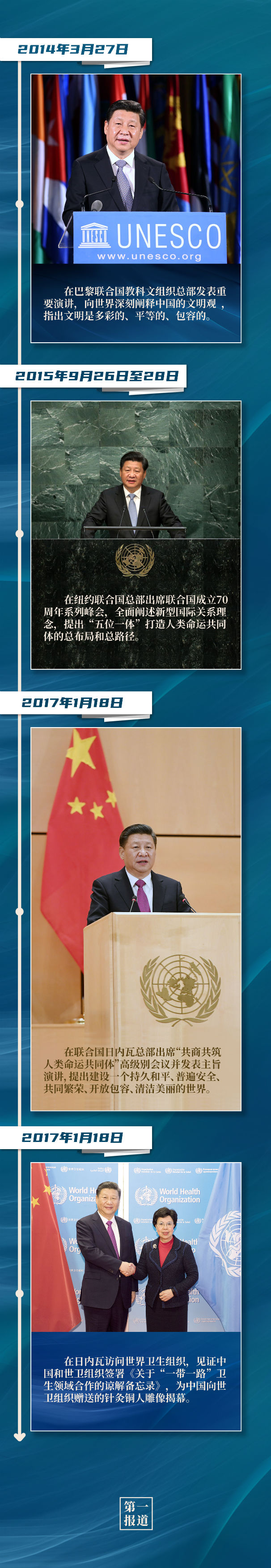紐約聯(lián)合國總部、聯(lián)合國日內(nèi)瓦總部、聯(lián)合國教科文組織總部、世界衛(wèi)生組織,這些地方都留下了習(xí)主席的訪問足跡。站在聯(lián)合國講臺,習(xí)主席闡述關(guān)于促進(jìn)世界和平發(fā)展的重要主張,表達(dá)對聯(lián)合國事業(yè)的堅定支持,傳遞攜手各方應(yīng)對全球挑戰(zhàn)、深化多邊合作的真誠意愿。
