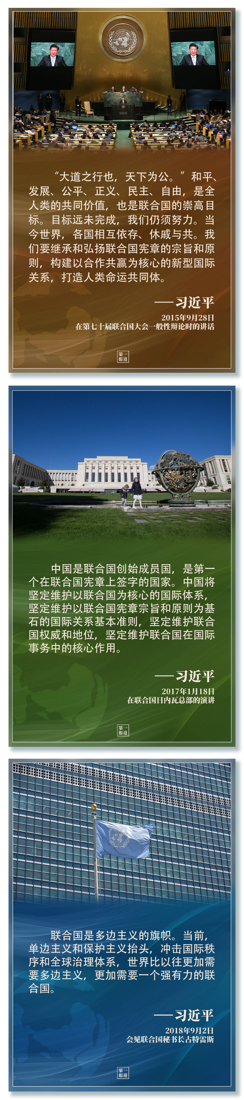 習(xí)主席指出,“支持聯(lián)合國發(fā)揮作用,維護(hù)聯(lián)合國權(quán)威和地位,是中國外交一項(xiàng)基本政策?!?/strong>2013年以來,習(xí)主席多次會見聯(lián)合國主要官員,訪問聯(lián)合國總部及聯(lián)合國專門機(jī)構(gòu),出席一系列聯(lián)合國活動……親自推動中國同聯(lián)合國的合作,發(fā)出支持聯(lián)合國事業(yè)、捍衛(wèi)多邊主義的中國強(qiáng)音。