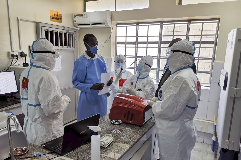 在南蘇丹首都朱巴的一處新冠病毒檢測(cè)機(jī)構(gòu),中國(guó)抗疫醫(yī)療專家組成員與南一線醫(yī)護(hù)人員交流(8月21日攝)。 新華社發(fā)(中國(guó)駐南蘇丹大使館供圖)