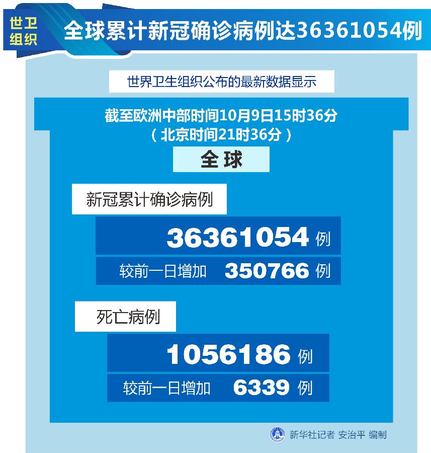 新華社日內(nèi)瓦10月9日電(記者劉曲)世界衛(wèi)生組織9日公布的最新數(shù)據(jù)顯示,全球累計(jì)新冠確診病例達(dá)36361054例。