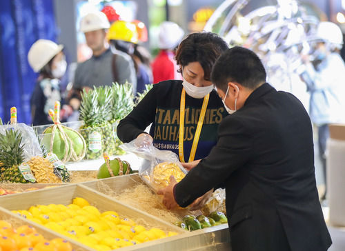 11月2日,在食品及農(nóng)產(chǎn)品展區(qū),一企業(yè)展臺的工作人員在擺放展品。連日來,第三屆中國國際進口博覽會舉辦地國家會展中心(上海)內(nèi)一派忙碌景象,各個展館的搭建和布置工作正有條不紊地進行。新華社記者 丁汀 攝