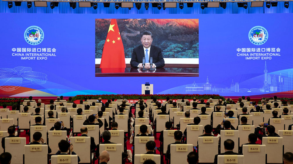 11月4日晚,習(xí)近平在第三屆中國國際進口博覽會開幕式上以視頻方式發(fā)表主旨演講。新華社記者 黃敬文 攝