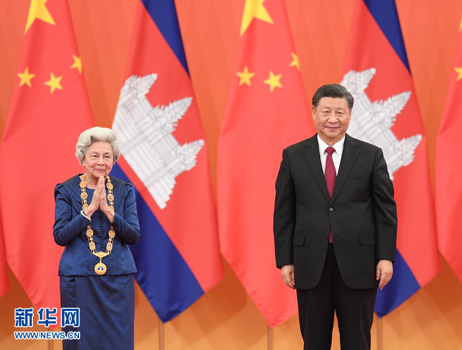 11月6日,國(guó)家主席習(xí)近平在北京人民大會(huì)堂為柬埔寨太后莫尼列舉行中華人民共和國(guó)“友誼勛章”頒授儀式。 新華社記者 張領(lǐng) 攝