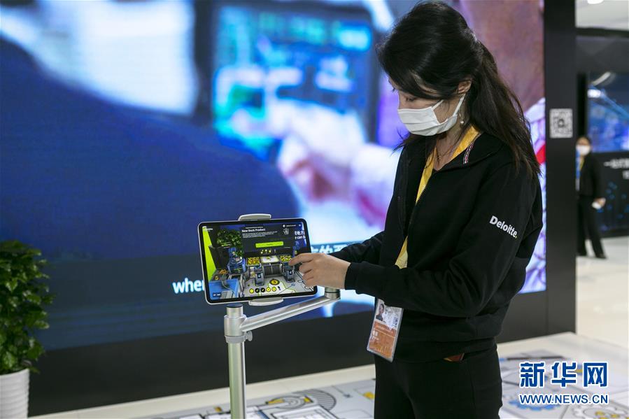 11月5日,在第三屆進(jìn)博會服務(wù)貿(mào)易展區(qū),德勤公司在中國首發(fā)“德勤小黃鴨智能工廠”,工作人員通過AR(增強(qiáng)現(xiàn)實(shí))技術(shù)展示智能工廠的應(yīng)用場景。 新華社記者 王翔 攝