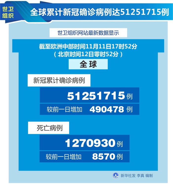 世衛(wèi)組織網(wǎng)站最新數(shù)據(jù)顯示,截至歐洲中部時間11日17時52分(北京時間12日零時52分),全球確診病例較前一日增加490478例,達(dá)到51251715例;死亡病例增加8570例,達(dá)到1270930例。