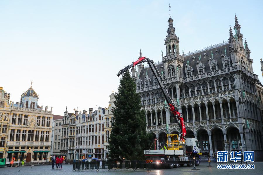 這是11月19日在比利時布魯塞爾大廣場拍攝的圣誕樹安裝現(xiàn)場。
