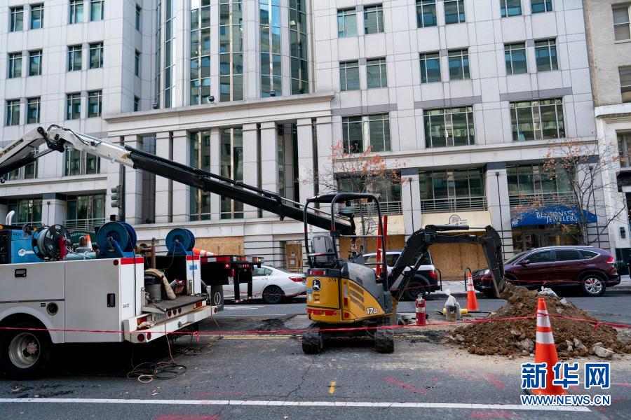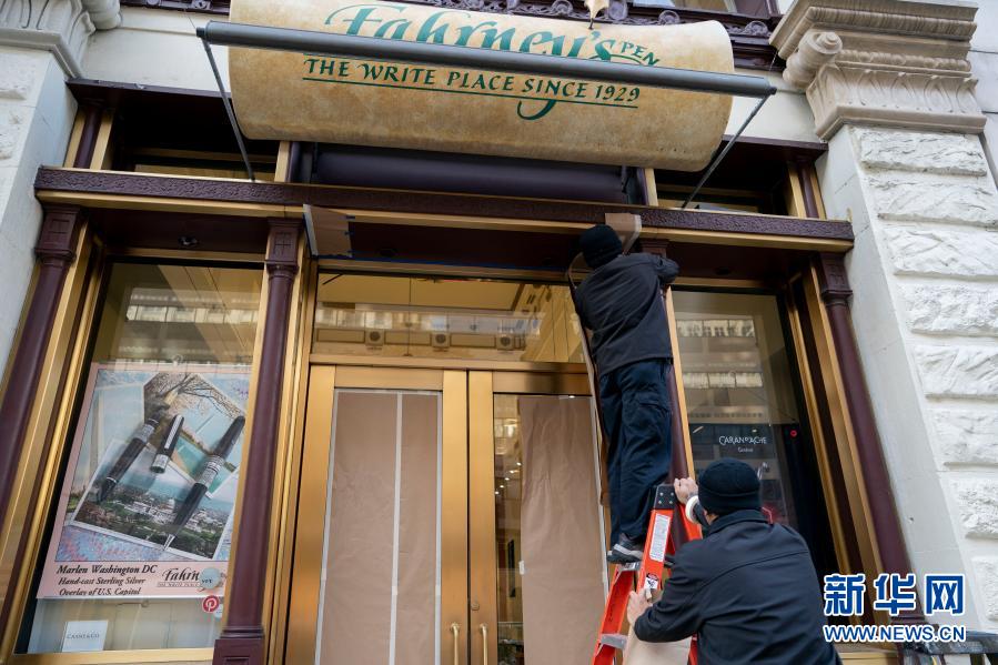 11月19日,在美國(guó)華盛頓,工作人員在裝修一家文具店的門(mén)臉。新華社記者 劉杰 攝
