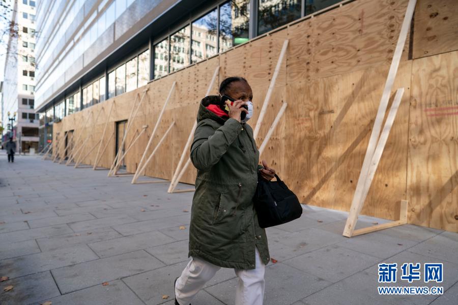 11月19日,在美國(guó)華盛頓,一名打電話(huà)的行人經(jīng)過(guò)用木板加固門(mén)窗的辦公樓。新華社記者 劉杰 攝