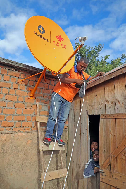 “萬村通”項目是2015年中非合作論壇約翰內(nèi)斯堡峰會提出的中非人文領(lǐng)域合作舉措之一,旨在為非洲國家的一萬個村莊接入衛(wèi)星數(shù)字電視信號。這一項目由中國的四達(dá)時代集團承建。