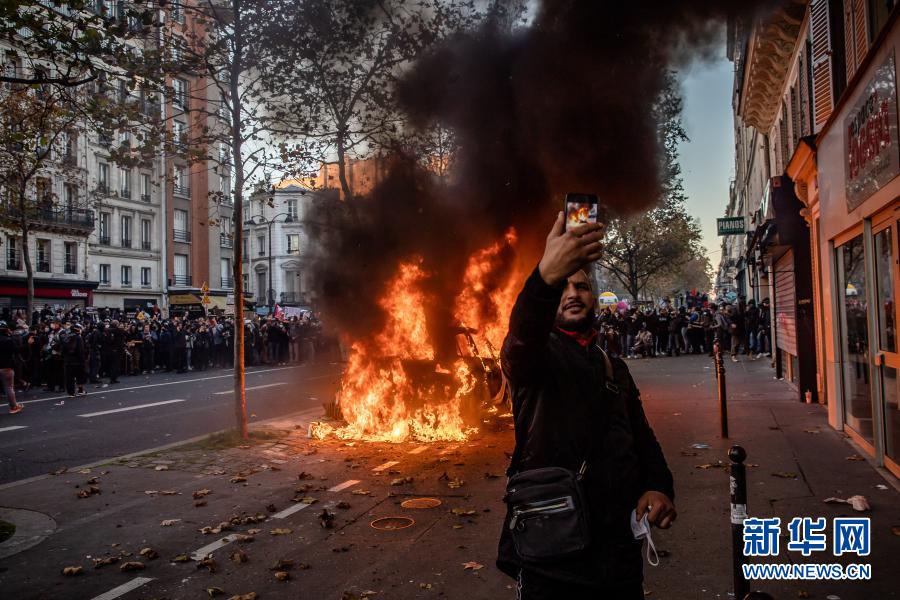 11月28日,在法國(guó)巴黎,一名男子在游行示威中被點(diǎn)燃的車輛前自拍。
