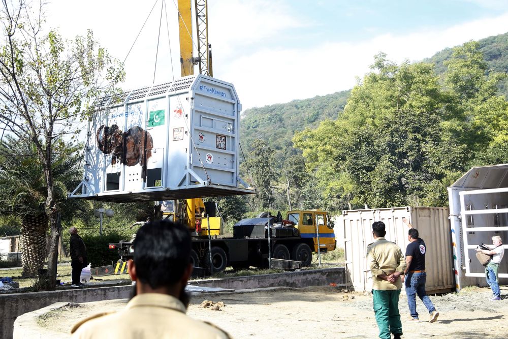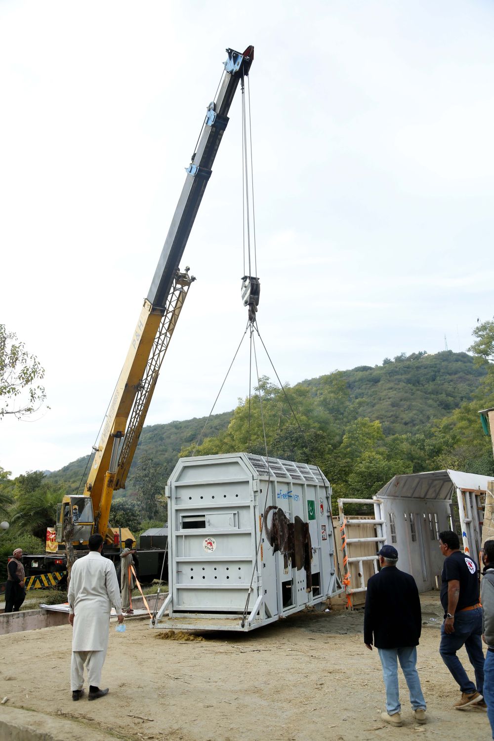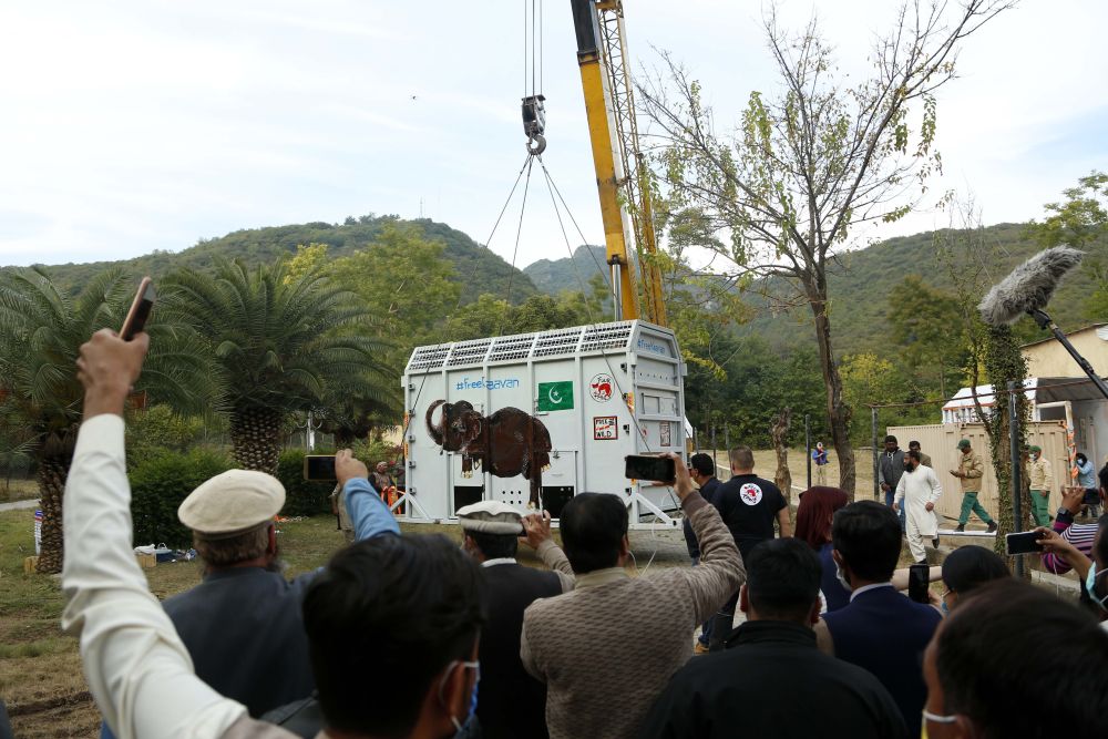 ↑11月29日,在巴基斯坦伊斯蘭堡,工作人員搬運裝有大象的運輸箱