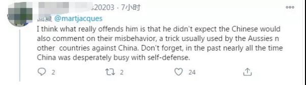 在這條推特下邊,許多網(wǎng)友為馬丁·雅克點贊。其中一位網(wǎng)友說道:“我認(rèn)為真正讓他惱火的是,他沒想到中國人也會對他們的不當(dāng)行為發(fā)表評論,這是澳大利亞人和其他國家對付中國的慣用伎倆。別忘了,在過去幾乎所有的時間里,中國都在拼命地進行自衛(wèi)?!?/p>
