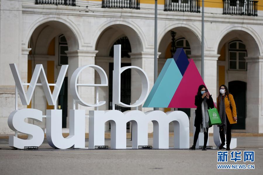 11月30日,在葡萄牙里斯本,兩名戴口罩的女子走過2020年網(wǎng)絡(luò)峰會的立體標識。
