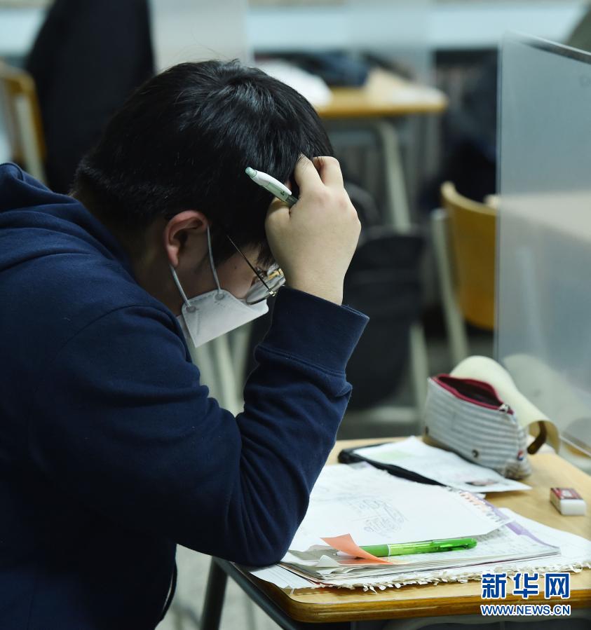 12月3日,在韓國京畿道城南市,一名考生準(zhǔn)備參加考試。新華社發(fā)(李相浩 攝)