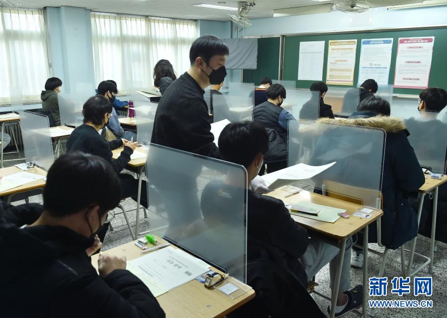 12月3日,在韓國京畿道城南市,監(jiān)考人員在某考點(diǎn)向考生分發(fā)試卷。新華社發(fā)(李相浩 攝)