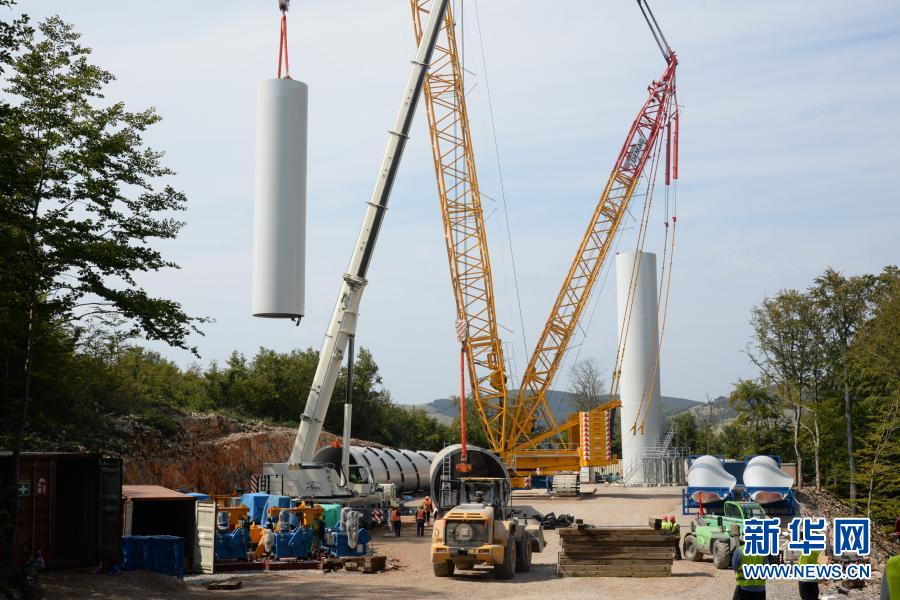 這是9月16日拍攝的克羅地亞塞尼風(fēng)電項目風(fēng)機(jī)塔筒吊裝施工現(xiàn)場。新華社記者 高磊 攝