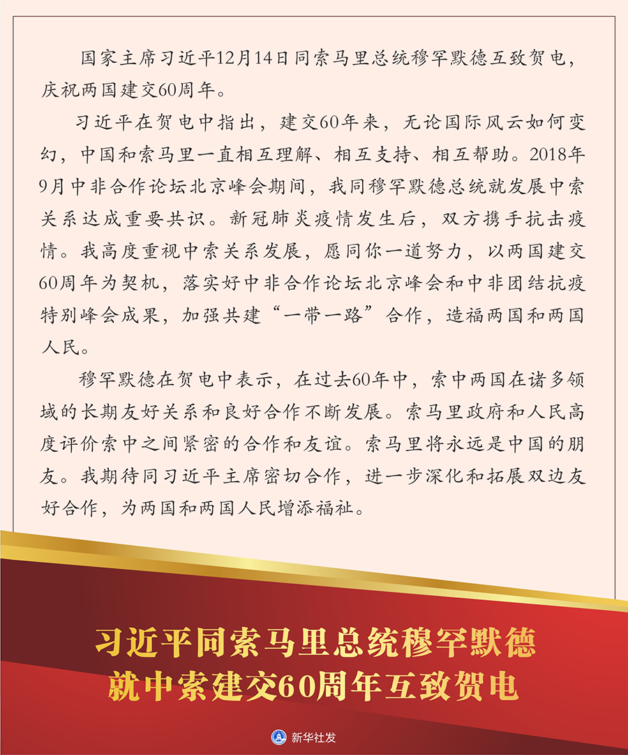 新華社北京12月14日電 國家主席習近平12月14日同索馬里總統(tǒng)穆罕默德互致賀電,慶祝兩國建交60周年。