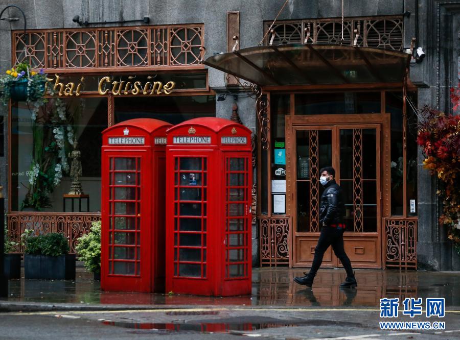 12月21日,一名戴口罩的男子經(jīng)過英國倫敦特拉法加廣場旁一家關閉的餐廳。新華社記者 韓巖 攝