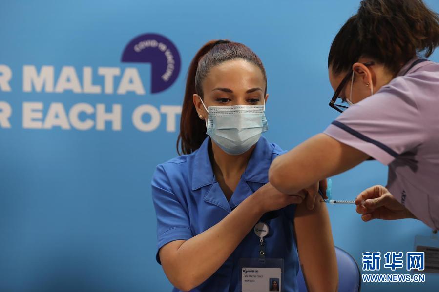 12月27日,在馬耳他瓦萊塔,國立圣母醫(yī)院護(hù)士蕾切爾·格雷奇接種新冠疫苗。新華社發(fā)(喬納森·博格 攝)