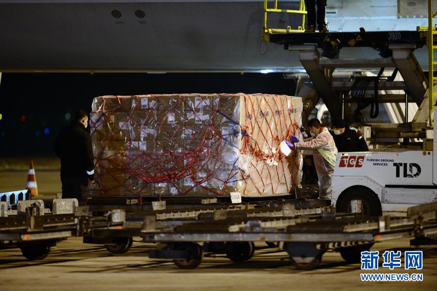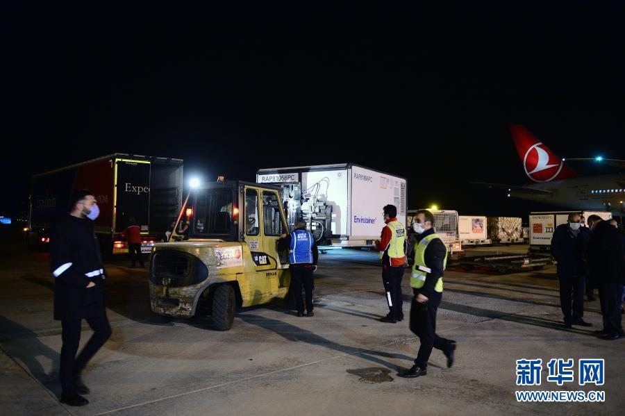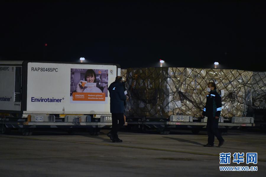12月30日,在土耳其安卡拉的埃森博阿機(jī)場,工作人員從飛機(jī)上搬運(yùn)中國科興公司生產(chǎn)的新冠疫苗。新華社發(fā)(穆斯塔法·卡亞攝)