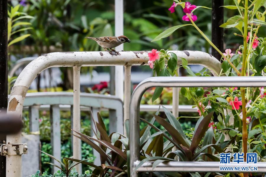 3月18日,在位于馬尼拉的菲律賓大學(xué)附屬菲律賓總醫(yī)院,一只麻雀站在“低語的花床”藝術(shù)裝置上。
