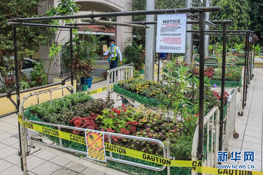 3月18日,在位于馬尼拉的菲律賓大學(xué)附屬菲律賓總醫(yī)院,一名安保人員看向“低語(yǔ)的花床”藝術(shù)裝置。