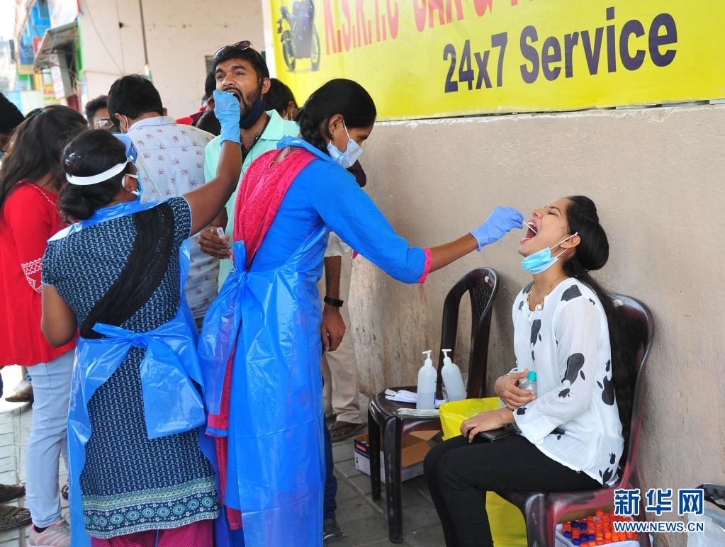 4月11日,人們在印度班加羅爾的一個(gè)公交站接受新冠病毒檢測取樣。
