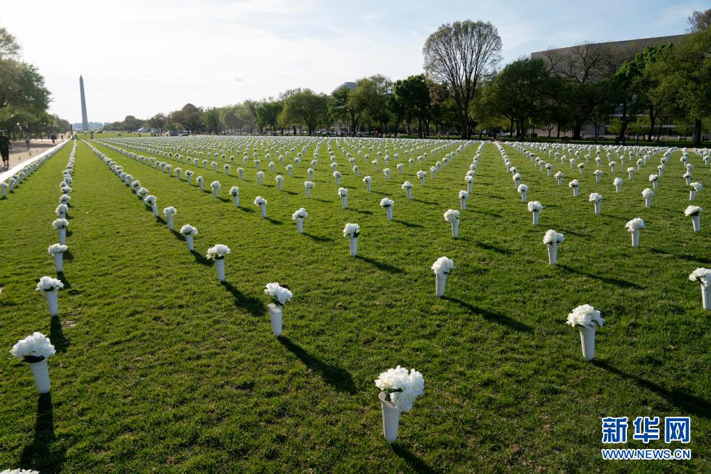 這是4月13日拍攝的美國(guó)華盛頓國(guó)家廣場(chǎng)草坪上擺放的白色絹花。